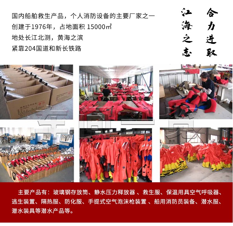 • 产品摘要:东台市江海救生消防设备有限公司成立于一九七六年," 江波"品牌为行业知名品牌。主要生产救生设备、消防器材、潜水装具等产品,产品获得3C,CCS,CMA,CE,ABS,EC等证书。公司联系电话:400-0515-698;邮箱:dtjhsb@163.com。